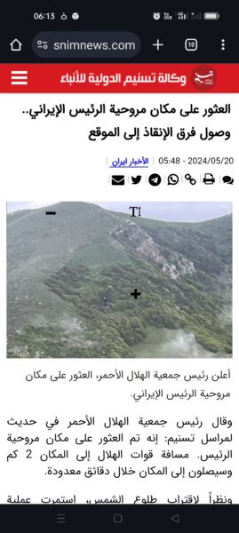 وأكد رئيس جمعية الهلال الأحمر، العثور على مروحية الرئيس، وقال: حالة المروحية ليست جيدة ونحن على بعد كيلومترين من المروحية. سنصل إلى موقع الحادث خلال دقائق قليلة وسنبلغ المواطنين بالحادث.
