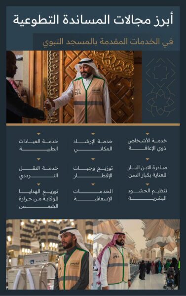ونفّذ 176 فريقًا تطوعيًا بالمسجد النبوي والساحات التابعة له أكثر من 198 فرصة تطوعية مساندة في مختلف التخصصات، تضمنت تقديم الخدمات للأشخاص ذوي الإعاقة، وخدمة الإرشاد المكاني، وخدمة العيادات الطبية، ومبادرة الابن البار لخدمة كبار السن، وتوزيع وجبات الإفطار، وخدمة النقل الترددي، وتنظيم الحشود البشرية، والخدمات الإسعافية، وتوزيع المظلات للوقاية من حرارة الشمس هديةً لقاصدي المسجد النبوي، قام بها أكثر من 16 ألف متطوع ومتطوعة، بإشراف ومتابعة من الهيئة العامة للعناية بشؤون المسجد الحرام والمسجد النبوي.
