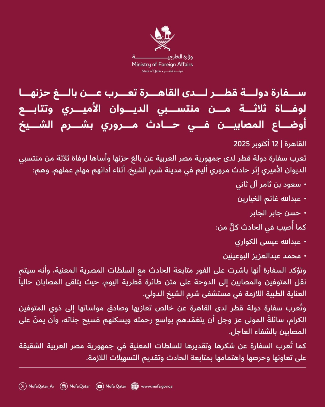 عبّرت سفارة دولة قطر لدى جمهورية مصر العربية عن بالغ حزنها وأسفها لوفاة ثلاثة من منتسبي الديوان الأميري القطري إثر حادثٍ مروريٍ أليم وقع بمدينة شرم الشيخ، بينما تتابع السفارة على مدار الساعة الحالة الصحية للمصابين الذين يتلقّون الرعاية الطبية اللازمة في المستشفيات المصرية.