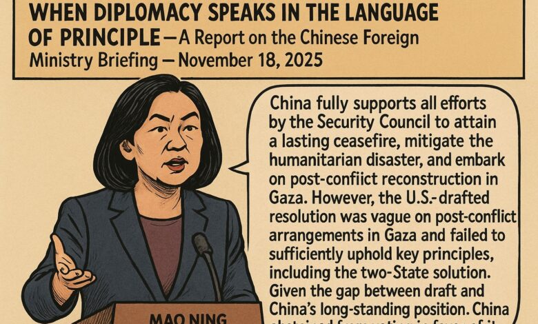 في الإيجاز الصحفي الدوري، قدّمت المتحدثة باسم وزارة الخارجية الصينية ماو نينغ شرحًا موسعًا حول الأسباب التي دفعت الصين — إلى جانب روسيا — للامتناع عن التصويت على مشروع قرار مجلس الأمن المتعلق بغزة.