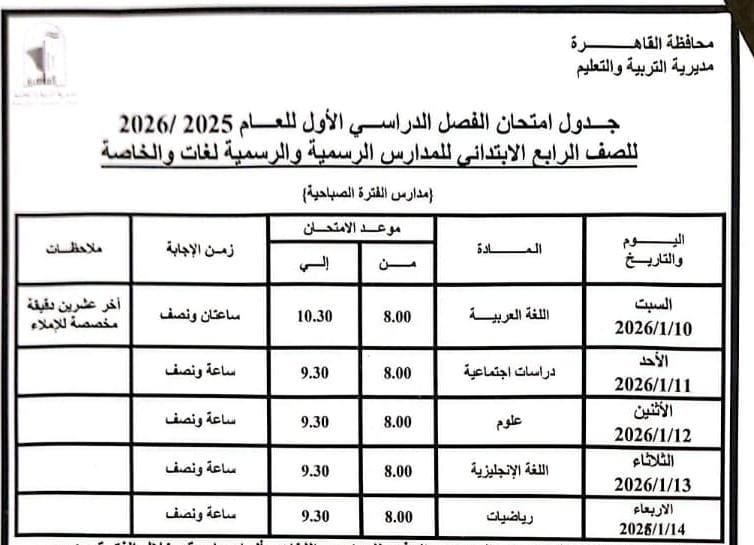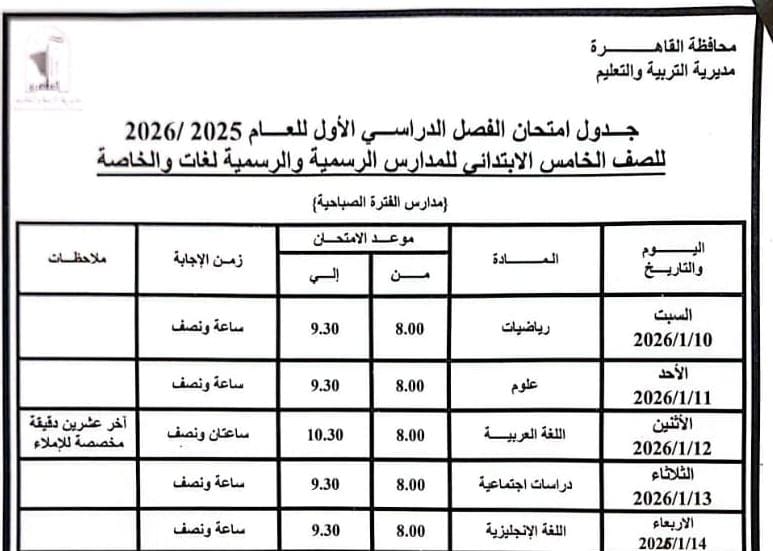 اعتمد د. إبراهيم صابر، محافظ القاهرة، جدول امتحانات الفصل الدراسي الأول للعام الدراسي ٢٠٢٥ / ٢٠٢٦، لتبدأ معه أيام الجدّ، حيث تُوزن المعرفة بميزان العدل، ويُختبر السعي تحت مظلة الطمأنينة.