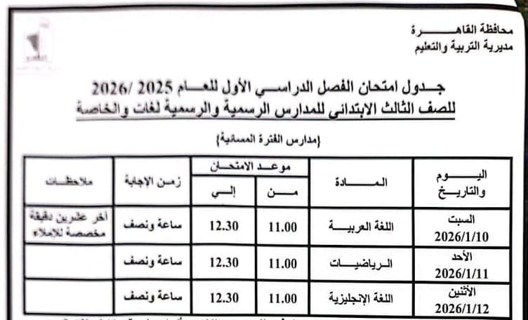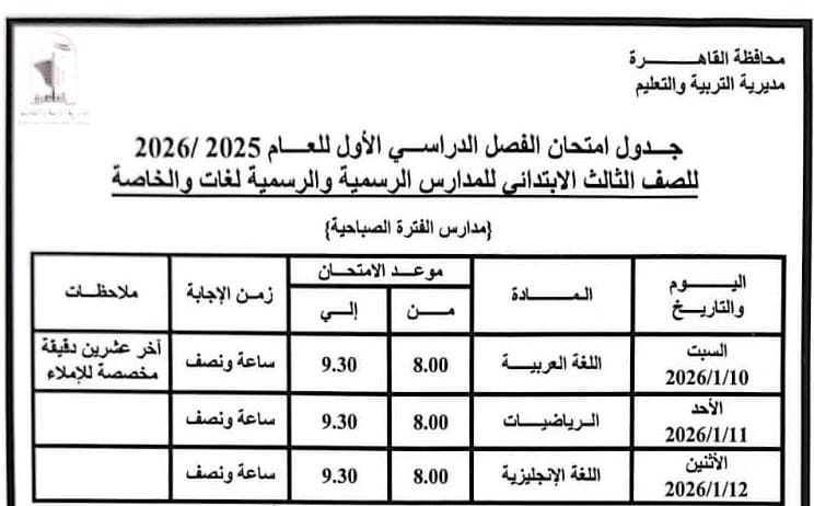 - الصف الثالث الابتدائي وما يعادله يؤدي الامتحانات من السبت ١٠ يناير حتى الاثنين ١٢ يناير.