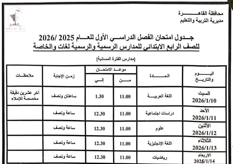 كما أشارت إلى أن الامتحانات ستتوقف خلال أيام ٦ و٧ و٨ يناير ٢٠٢٦ بمناسبة أعياد الميلاد، وكذلك يوم الاثنين ١٩ يناير ٢٠٢٦ بمناسبة عيد الغطاس.