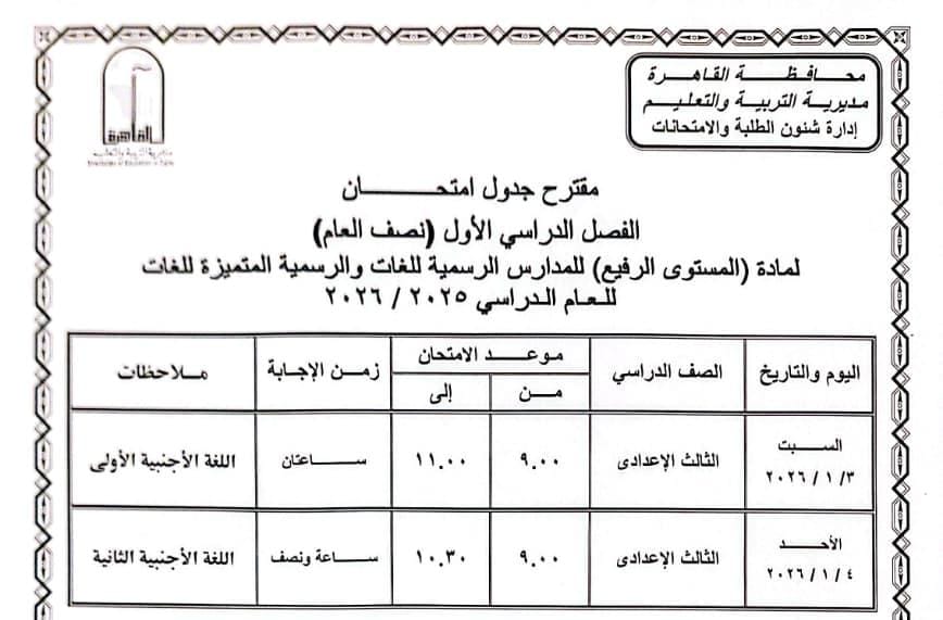 ومن جانبها، أوضحت د. همت أبو كيلة، مدير مديرية التربية والتعليم بالقاهرة، أن امتحانات المستوى الرفيع والمواد التي لا تُضاف إلى المجموع لصفوف النقل ستُعقد يومي السبت ٣ يناير والأحد ٤ يناير ٢٠٢٦.