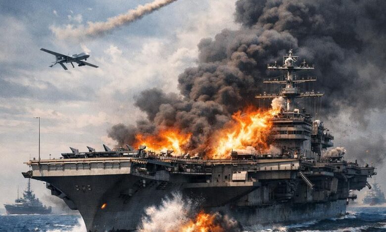 في مشهدٍ ينذر بتصعيد خطير في واحدة من أكثر مناطق العالم توترًا، تُظهر الصورة حاملة الطائرات الأمريكية «إبراهام لينكولن» وهي تتعرض لهجوم بطائرات مُسيّرة وصواريخ قرب مضيق هرمز، بينما تتصاعد ألسنة اللهب والدخان من سطحها في لحظة توحي بأن ميزان الردع البحري قد دخل مرحلة غير مسبوقة من الاختبار.