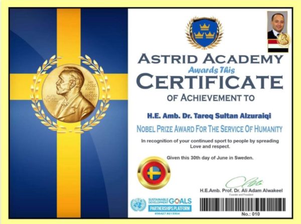 ومنحت أكاديمية أستريد السويدية الباحث الزريقي وهو رئيس المفوضية الدولية للسلام والحقوق والحريات في اليمن ، جائزة نوبل للسلام ، نسخة رمزية من جائزة نوبل للأكاديمية السويدية ، والتي يتم منحها لأبرز الشخصيات في العالم العاملة في مجال السلام العالمي ، بالإضافة إلى جائزة وميدالية الملك أدولف غوستاف للسلام ، نسخة رمزية من جائزة جامعة أوبسالا السويدية للشخصيات البارزة والأكاديمية ، وأشارت الأكاديمية إن منحها الزريقي لهاتين الجائزتين الدوليتين لجهوده ودوره في عملية نشر السلام على المستوى المحلي والإقليمي والدولي.