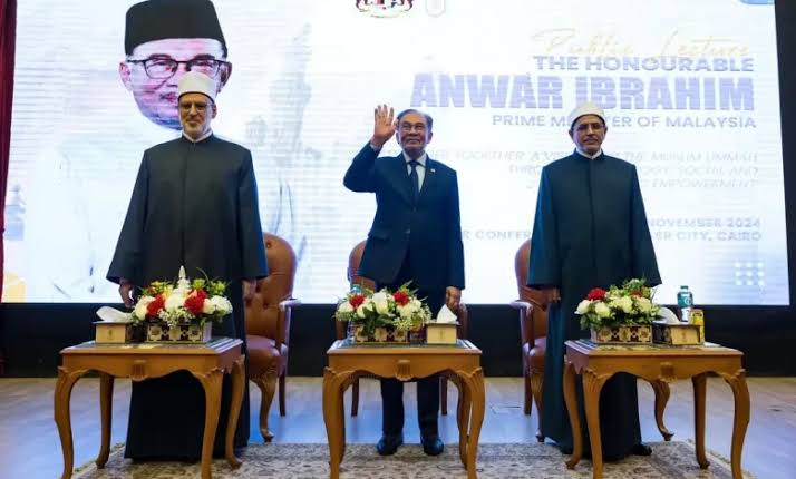 Malaysian Prime Minister Dr. Anwar Ibrahim delivered a speech today at Al-Azhar Conference Center in the presence of the Deputy Grand Imam of Al-Azhar Dr. Al-Diwani, as well as the President of Al-Azhar University Dr. Salama Daoud, politicians, media professionals, deans of Al-Azhar faculties, Malaysian students at Al-Azhar University, etc.