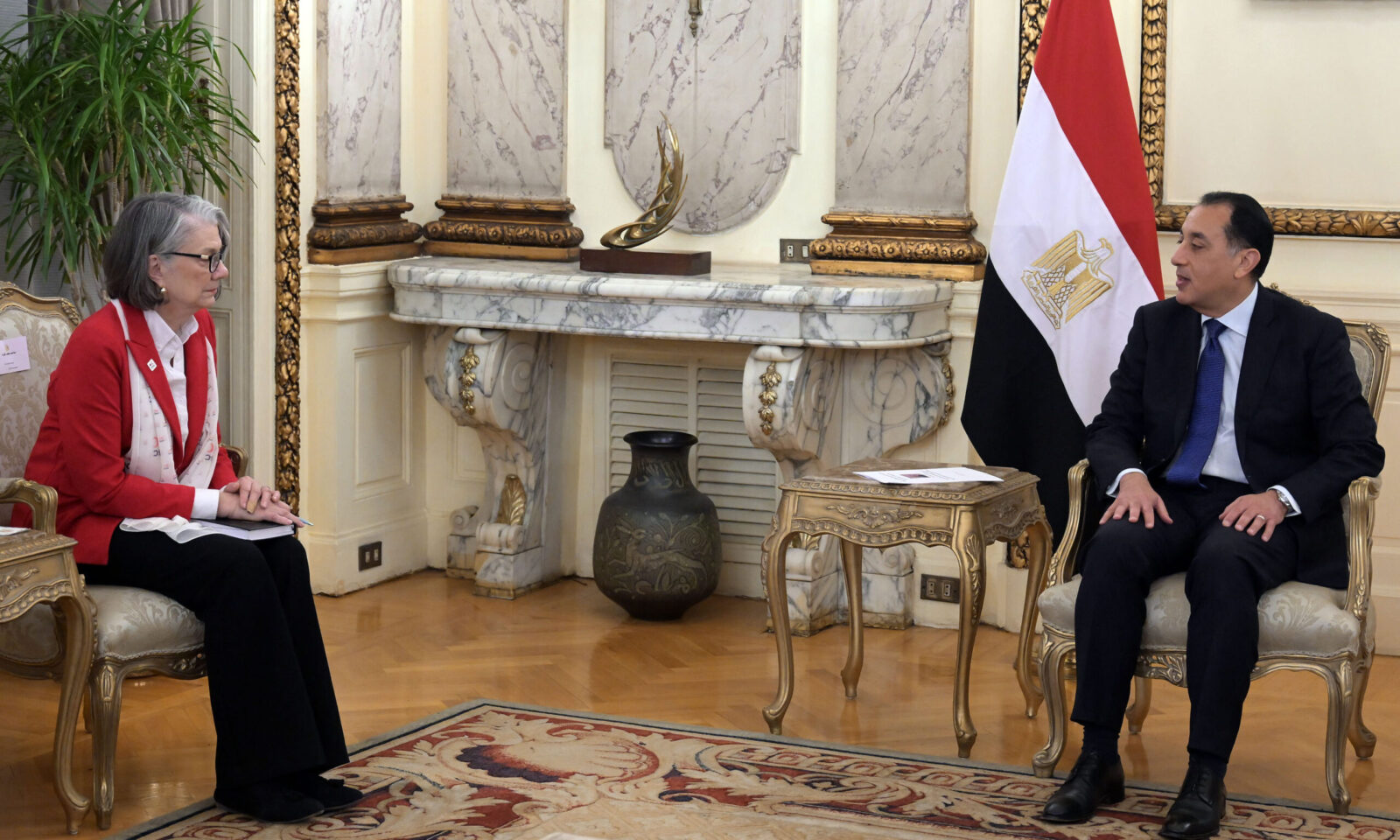 Dr. Mostafa Madbouly, Prime Minister, received today Ms. Kate Forbes, President of the International Federation of Red Cross and Red Crescent Societies, in the presence of Dr. Maya Morsi, Minister of Social Solidarity, and Ambassador Mohamed Mounir, Deputy Assistant Minister of Foreign Affairs for International Humanitarian Affairs.