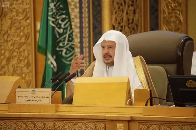 The Speaker is accompanied by a delegation of Shura Council members, including Mr. Saad bin Sulaib Al-Otaibi, Mr. Ajlan bin Abdulaziz Al-Ajlan, Mr. Abdullah bin Ahmed Al-Tawi, Dr. Amal bint Yahya Al-Sheikh, Dr. Ghada bint Talaat Al-Huthaili, along with a number of council officials.