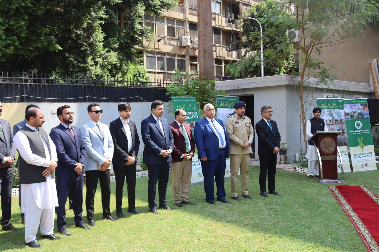 The Embassy of Pakistan in Cairo marked Defence and Martyrs Day with a solemn Flag Hoisting Ceremony. Ambassador Aamir Shouket raised the national flag to the resonant tune of the National Anthem, a moment echoing pride and remembrance.