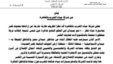تعلن شركة مياه الشرب بالقاهرة أنه نظرا لظروف طارئة خارجة عن إرادتها بحدوث كسر بماسورة مياه…