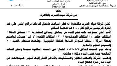 أعلنت شركة مياه الشرب بالقاهرة عن تنفيذ أعمال لحامات برافع أطلس على خط الطرد الرئيسي بقطر 1000 مم بمدينة السلام،…